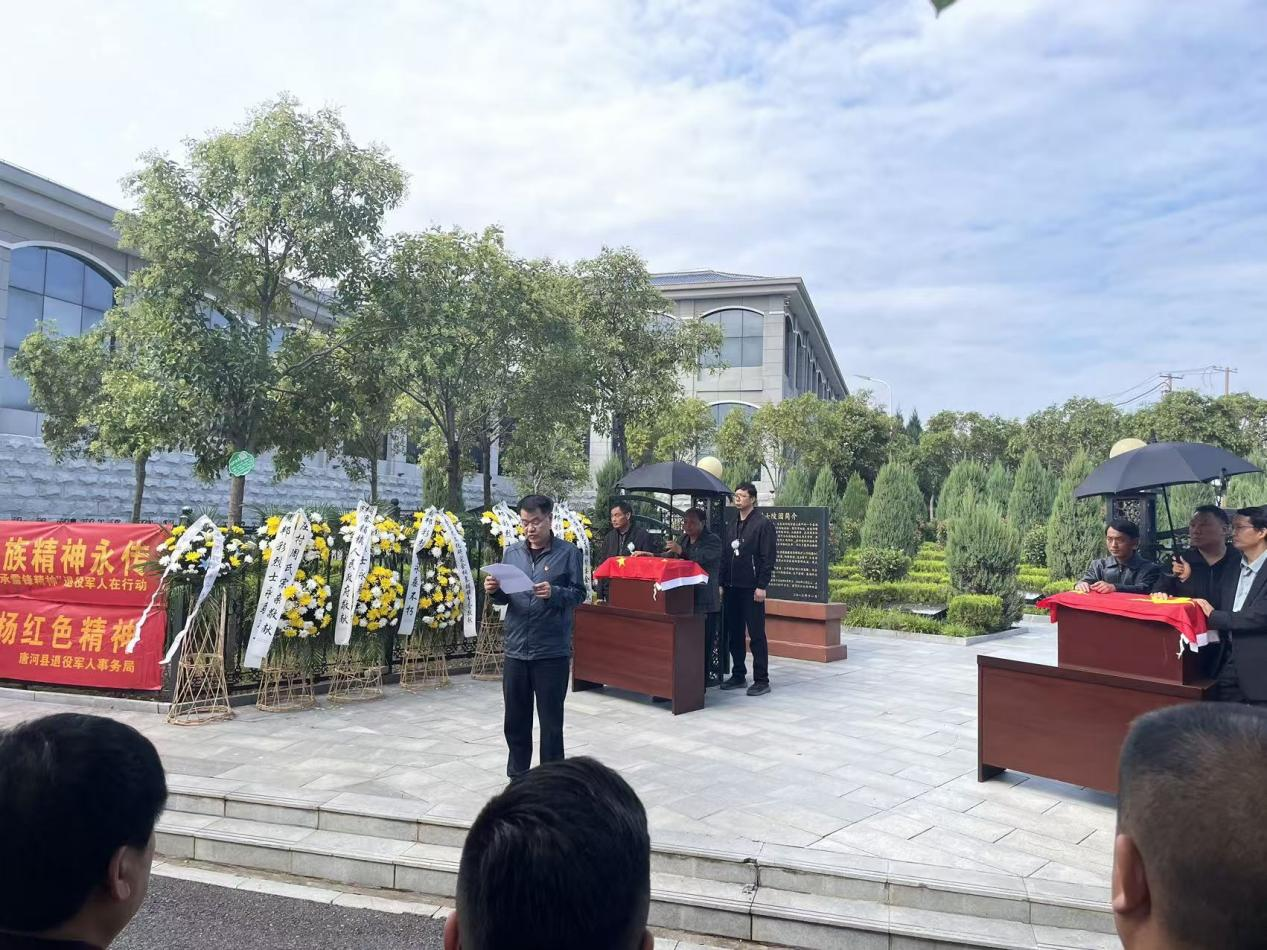 新农村融媒网讯 (向前 常静乾 杨本顺 张炳轩)青山埋忠骨,史册载英名。为深切缅怀革命先烈,传承红色基因,深入贯彻落实习近平总书记关于缅怀先烈、崇尚英雄、关爱英雄的重要指示精神,2025年9月25日上午,在唐河县政府的高度重视下,唐河县退役军人事务局、桐寨铺镇政府、苍台镇政府、中共唐河县委党史和地方史志研究室、各界代表、烈士亲属隆重为周邦彩、阎普润烈士遗骸举行迁葬唐河县烈士陵园仪式。
