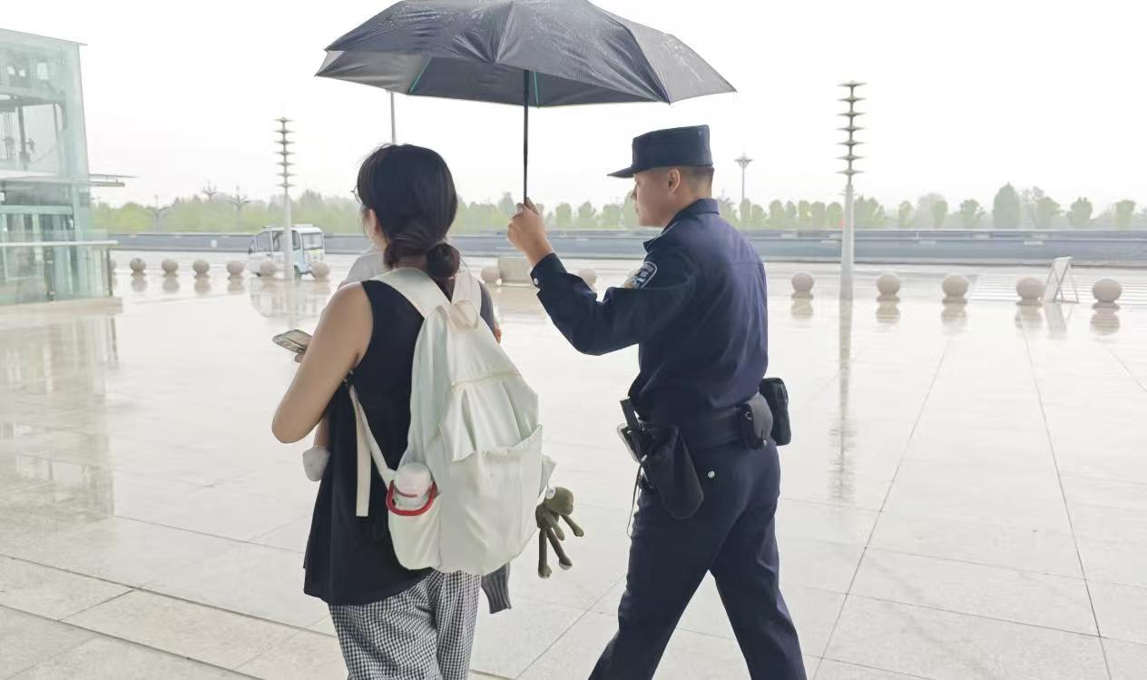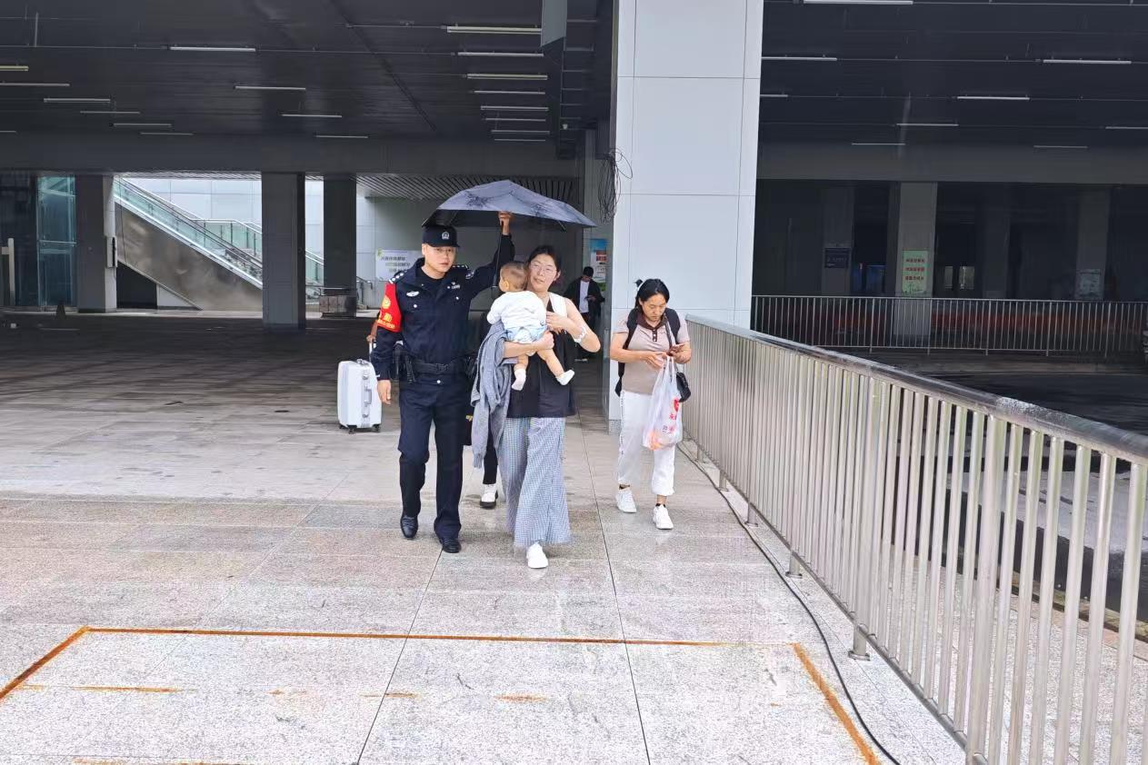 “别慌!有我们在,肯定帮您解决!”冯新月一边安抚旅客情绪,一边和辅警高英杰上前帮忙拎起行李。两人注意到孩子面色潮红、不停流鼻涕,立刻先为孩子接来温水喂服,暂时缓解其不适。眼看雨势渐大,考虑到老人和孩子行动不便,两人当即决定:护送一家人前往公交车站,确保他们顺利转乘。